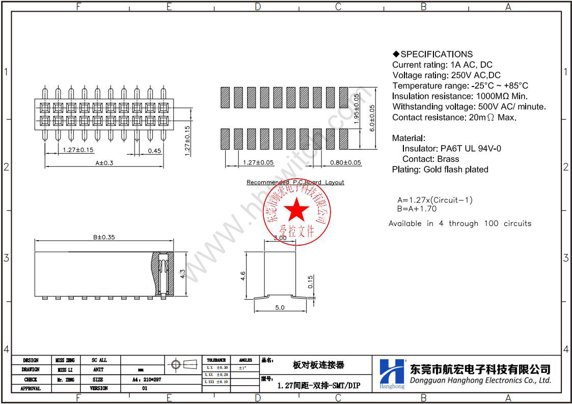 产品型号:1.27间距-双排-DIP/SMT-板对板连接器