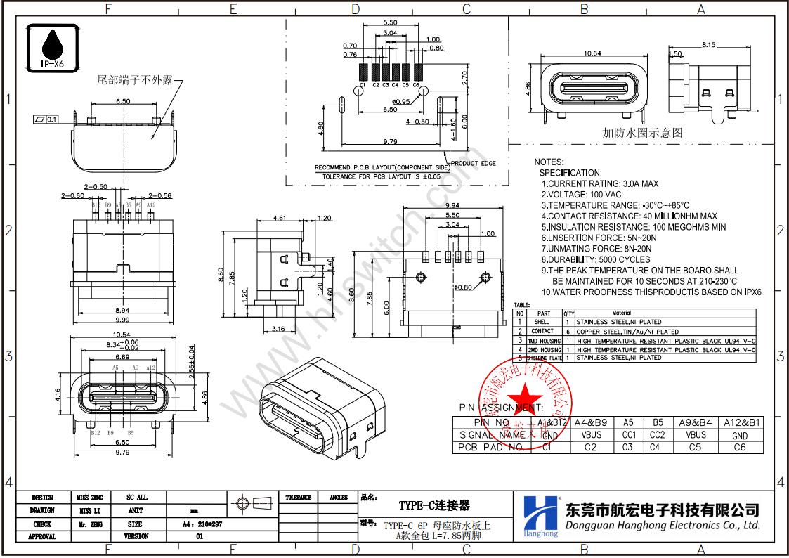 TYPE-C 6P 防水母座立式贴板H=6.0mm